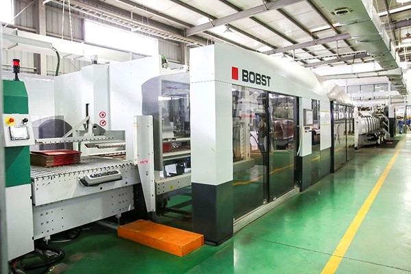 ![]() | The company has an advanced corrugated paperboard production line imported from Germany and a five-color flexographic box production line imported from France, which have significantly enhanced the automation control of production. The German BHS Star Five-Layer Corrugated Paperboard Production Line has a maximum speed of 300 meters per minute and an annual production capacity of up to 100 million square meters. This production line adopts the most advanced international production techniques, has an extremely high level of intelligence, is equipped with QDM, and can remember and retrieve production data for orders to ensure stable operation; at the same time, the corrugating rollers are installed by clamps and heated around, and changing the corrugating rollers can be done in the fastest 15 minutes, greatly improving the efficiency of changing corrugated sheets. The French BOBST (Boest) FFG 8.20 Fully Automatic Box Production Line has a production speed of 24,000 boxes per hour and only requires 3 people to operate the machine easily, making it the first of its kind in China of this type of box production line. The entire line has a quick setup function, requiring only 1 to 2 minutes to complete order changes, and can produce high-efficiency rule-cut boxes according to production rules, with functions such as SOC (single order completed, the next order automatically arrives), five-color printing, and automatic printing error correction. |